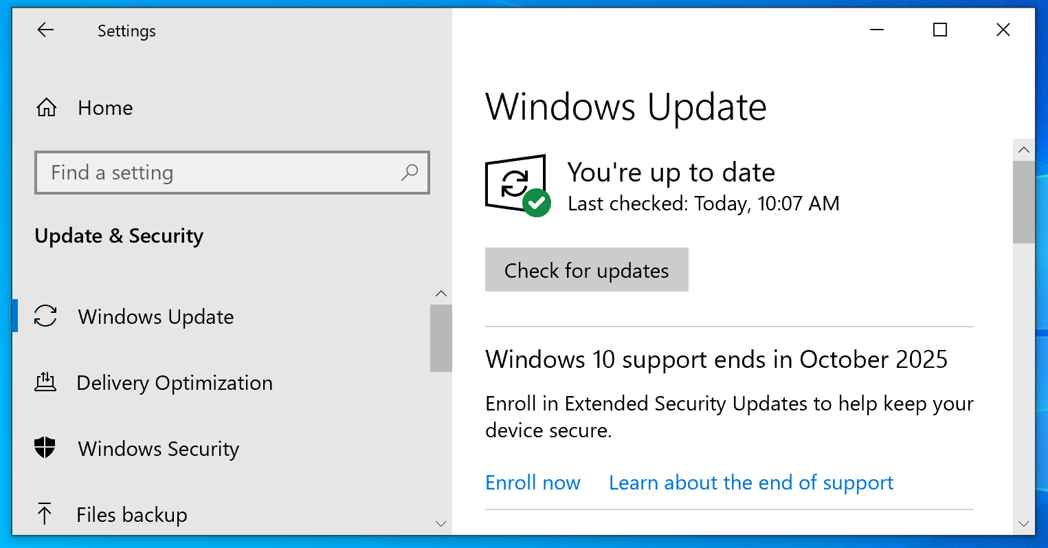 If your PC isn’t up-to-date yet, you’ll have to let Windows Update automatically install whatever updates are available. If it is up to date, you’ll see a “Windows 10 support ends in October 2025” message. Click “Enroll now.”