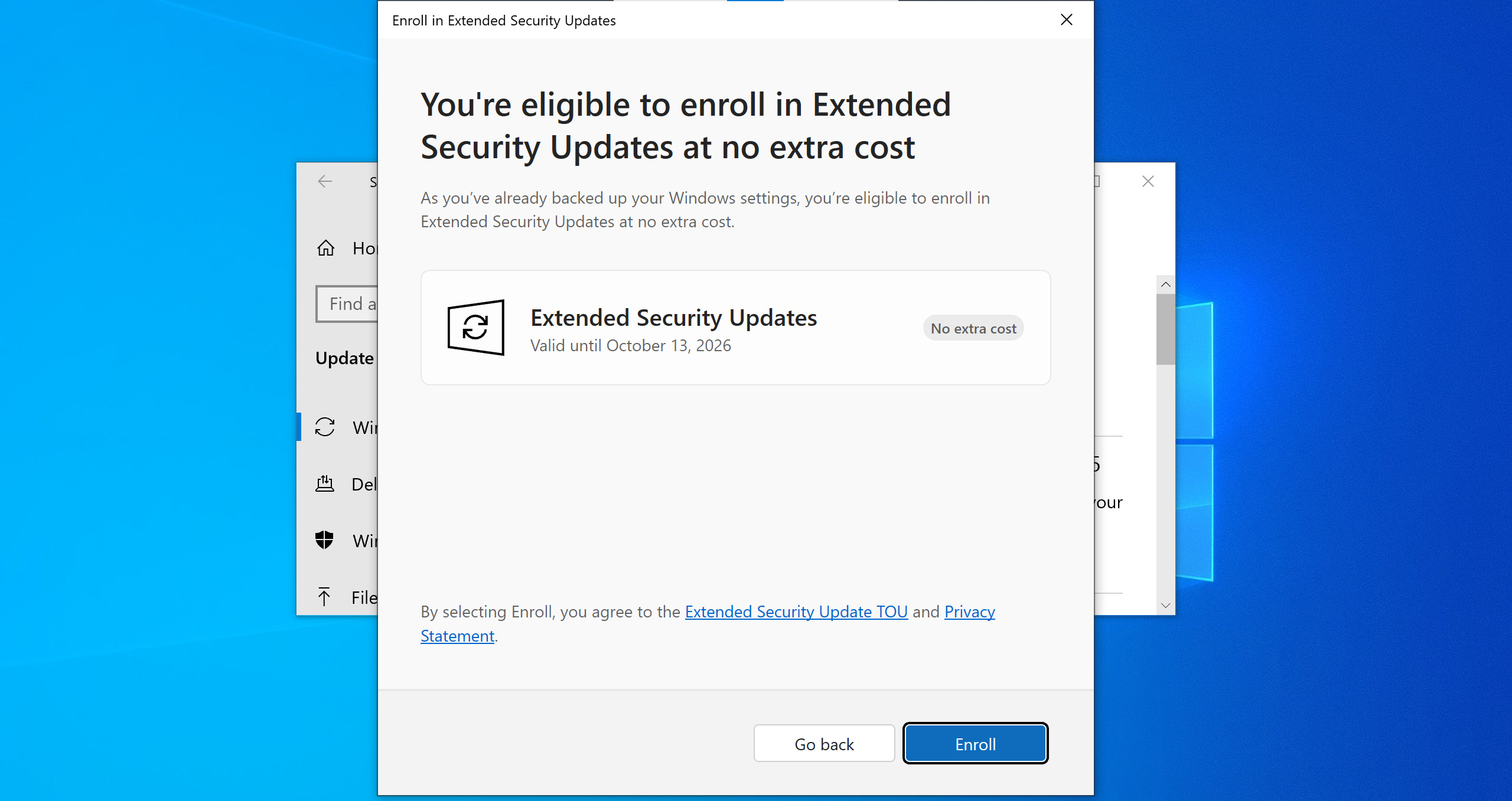 If your PC is already enrolled in ESUs, you’ll see “Your PC is enrolled to get Extended Security Updates” message on this page and Windows Update will work normally — until October of 2026.