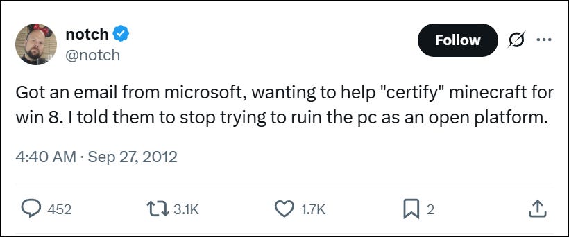 With Windows 8, Microsoft upset so many of its hardware partners and software developers. The mood at the time was perhaps best exemplified by Notch, the creator of Minecraft, who accused Microsoft of “trying to ruin the PC as an open platform.”